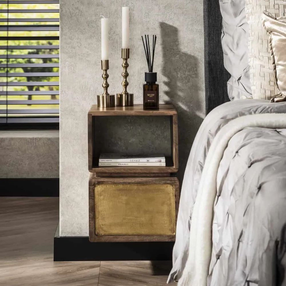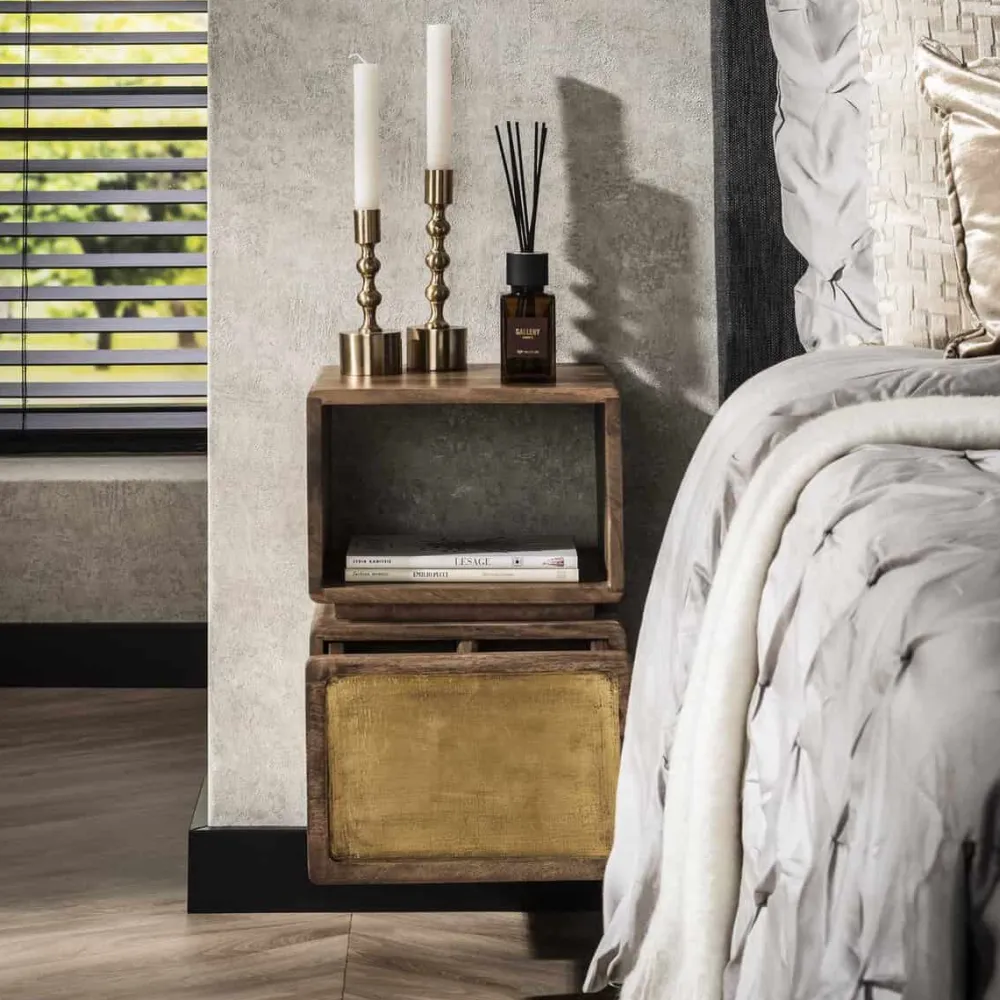 Dit hangende nachtkastje Katey is gemaakt van massief duurzaam mango hout en heeft een echt messing beslag. Dit wordt door middel van cladding gecreëerd. Het messing is licht geantiqueerd. Het nachtkastje beschikt over één lade en één open vak. Het nachtkastje wordt bevestigd aan de muur met een strip met drie schroefgaten, waardoor het zweeft en ruimte bespaart.