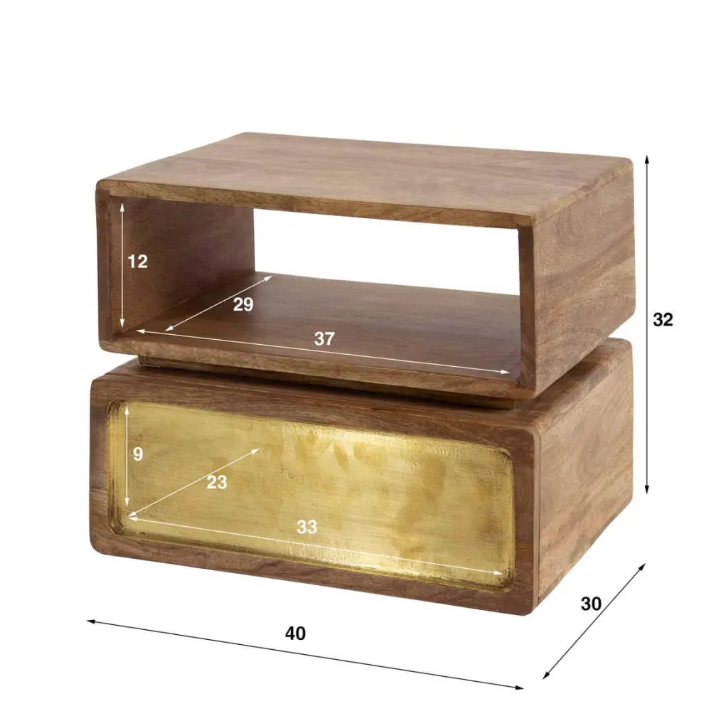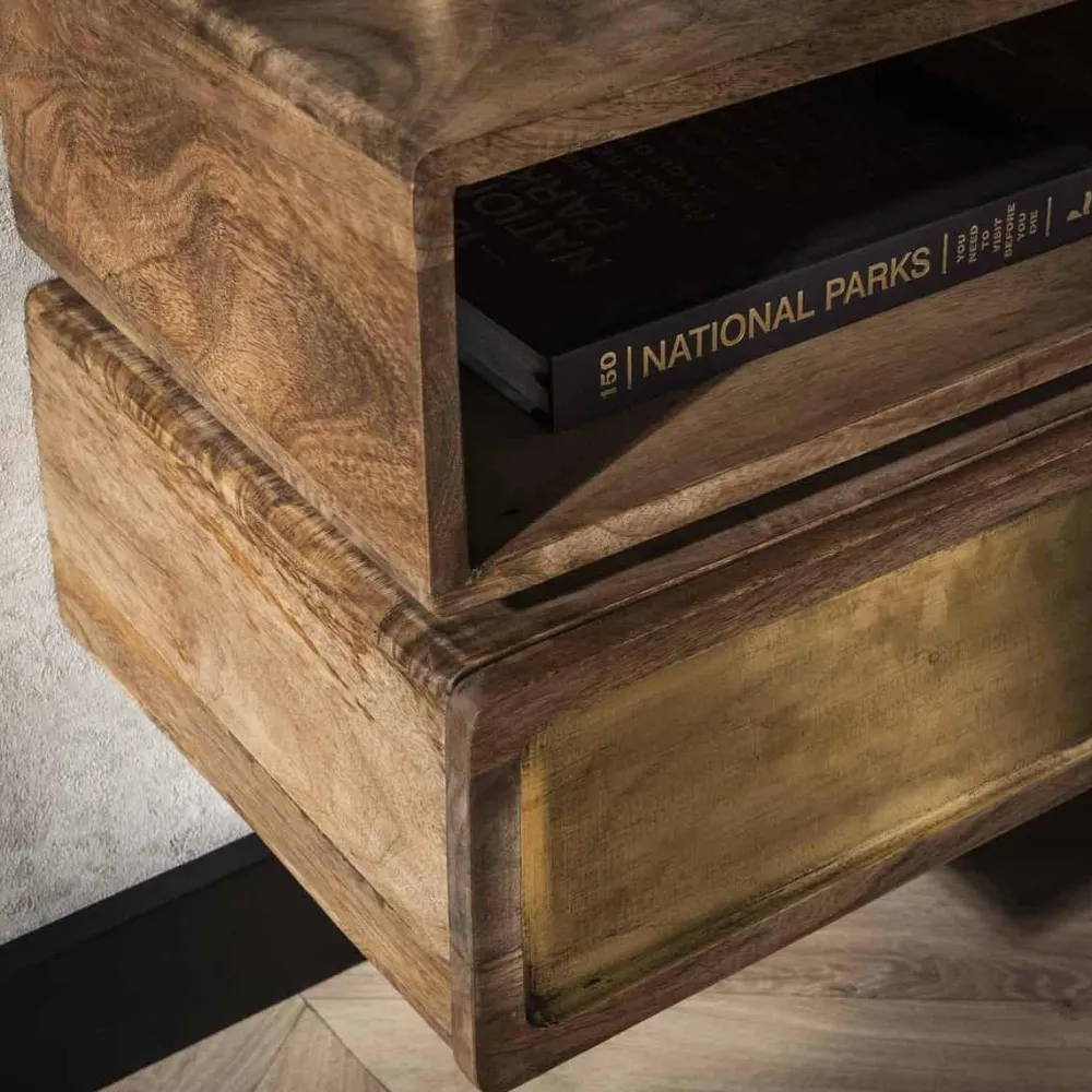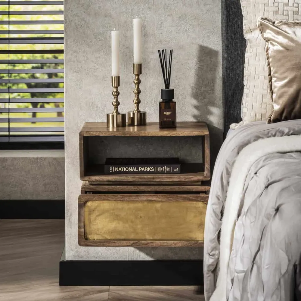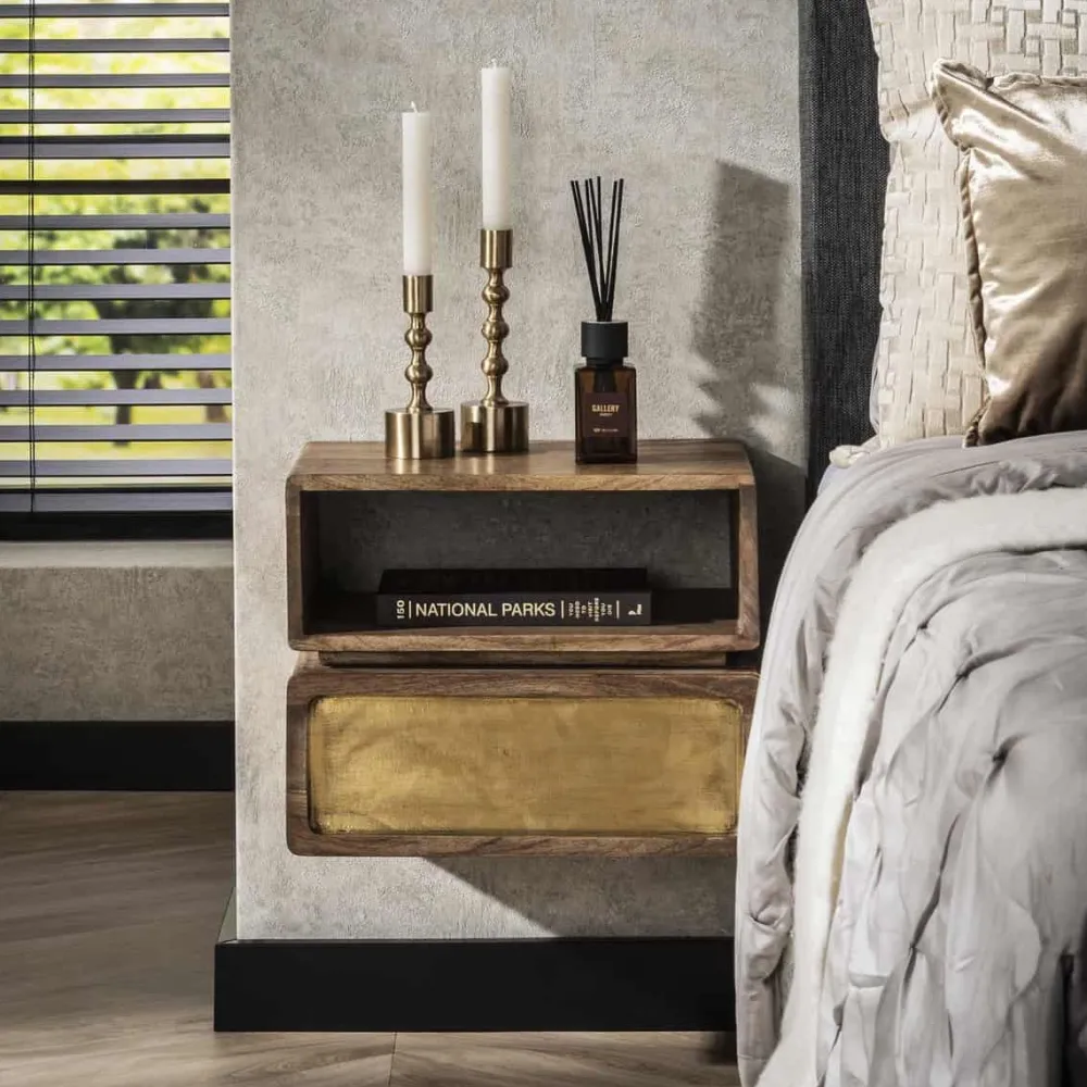 Dit hangende nachtkastje Kendal is gemaakt van massief duurzaam mango hout en heeft een echt messing beslag. Dit wordt door middel van cladding gecreëerd. Het messing is licht geantiqueerd. Het nachtkastje beschikt over één lade en één open vak. Het nachtkastje wordt bevestigd aan de muur met een strip met drie schroefgaten, waardoor het zweeft en ruimte bespaart.