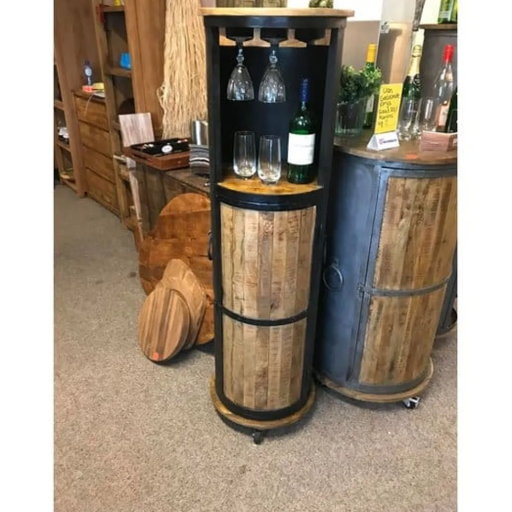 Deze stoere wijnkast is een echte eyecatcher voor het interieur. De ronde industriële ronde wijnkast op wielen is gemaakt van mangohout en is voorzien van zwart stalen elementen. Aan de bovenzijde is het mogelijk om wijnglazen op te hangen en aan de onderzijde bevindt zich een deur. De binnenruimte is ruim en voorzien van een legplank en wijnhouders waar meerdere flessen wijn in opgeborgen kan worden.