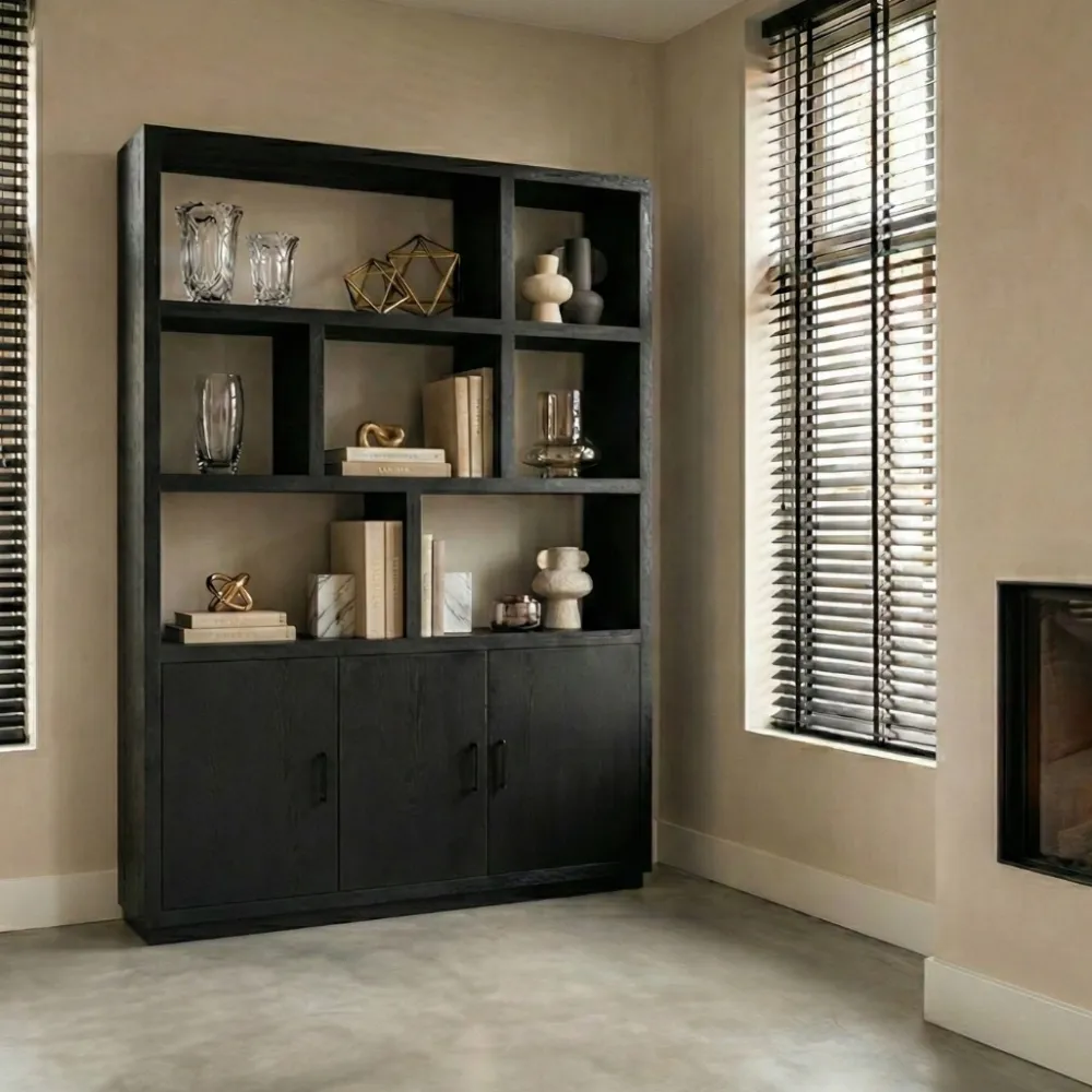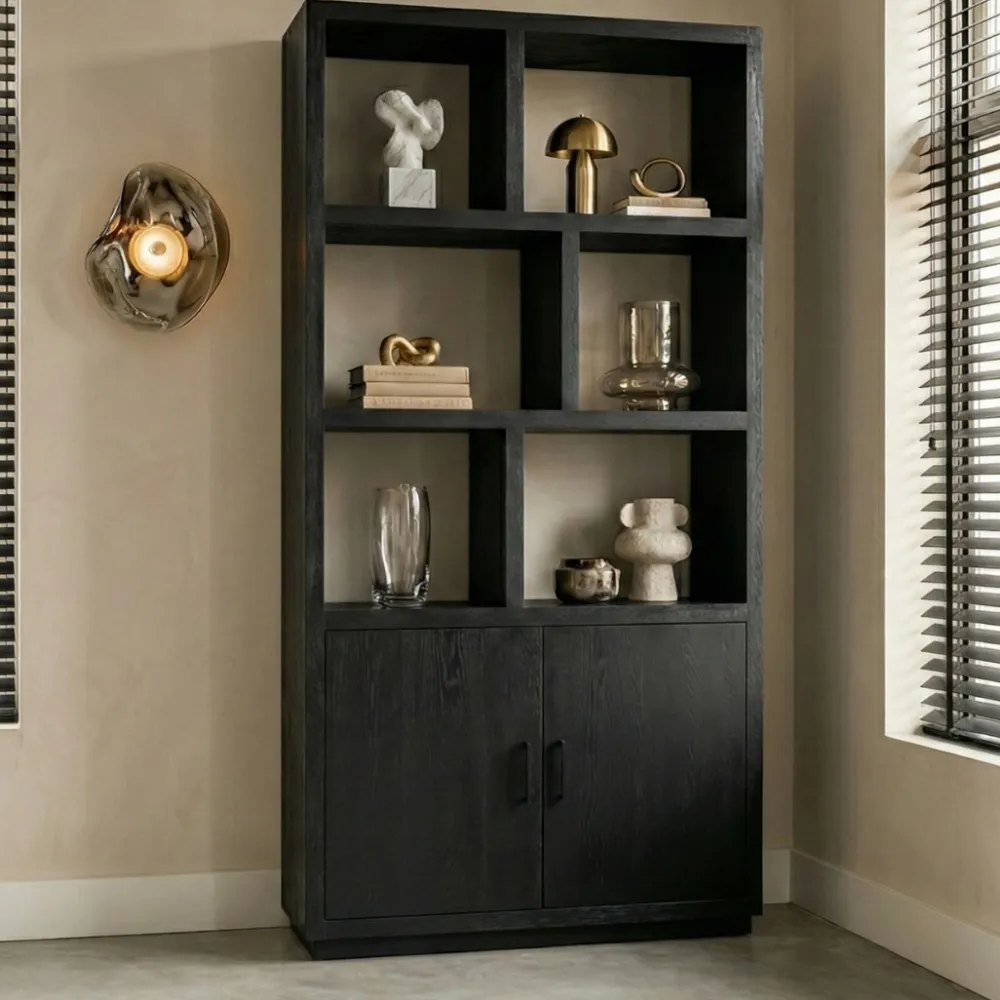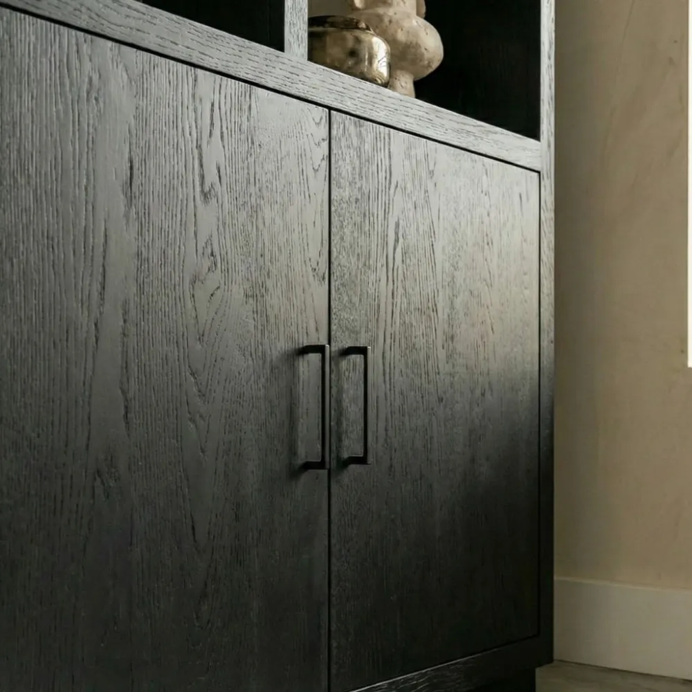 De hoge kast Luca is er in twee maten; 100cm en 150cm. De kast is gemaakt van zwartgelakt mangohout. De kleine kast heeft twee deuren aan de onderkant en de grote kast zelfs drie! Je kan de kast tof inrichten met mooie accessoires in de verschillende vakken. De vakken hebben allemaal een andere maat, dus dit zorgt voor een speels effect!