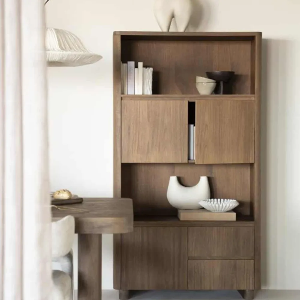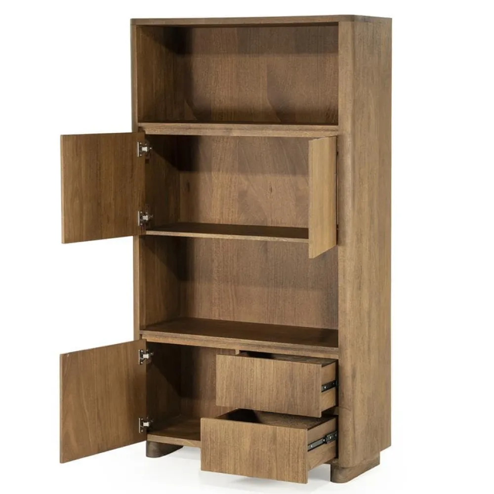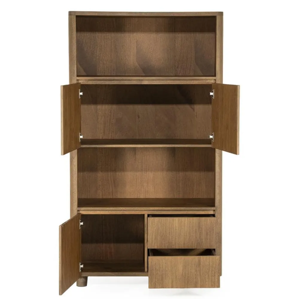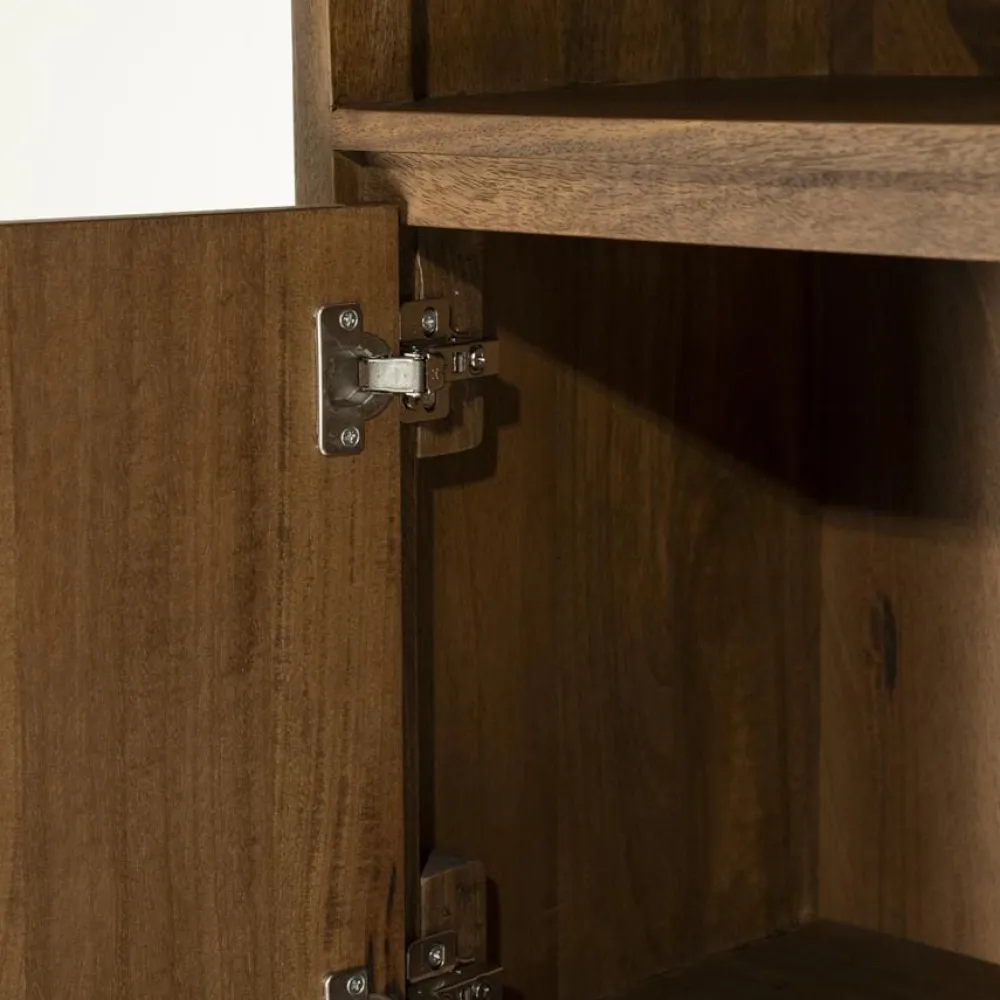 De opbergkast Edward is gemaakt van geborsteld mangohout en straalt warmte en karakter uit. Het moderne, minimalistische design wordt gecombineerd met praktische opbergruimte: achter de deuren en in de lades kun je makkelijk spullen uit het zicht opbergen, terwijl de open vakken ideaal zijn voor decoratie of boeken. Met Edward haal je een stijlvolle opberger in huis die past in elk interieur.