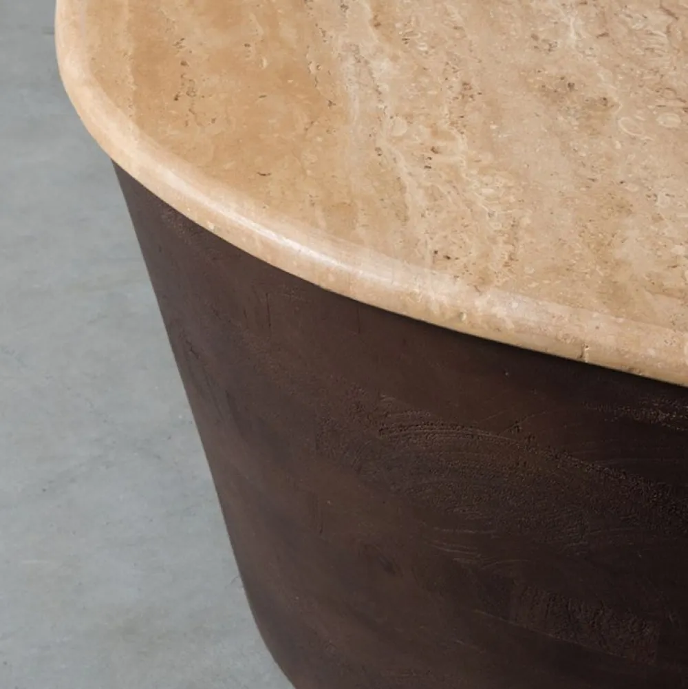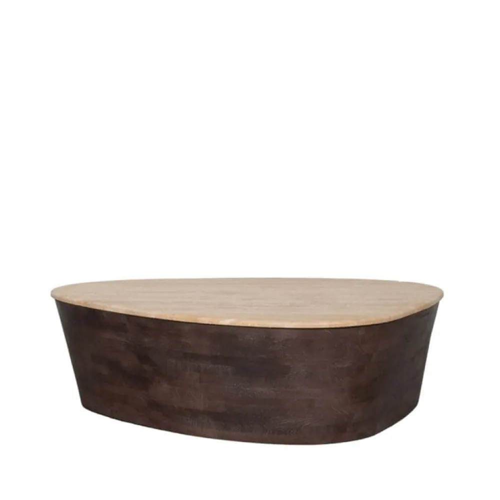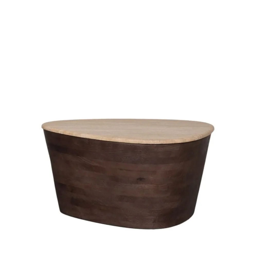De Ravi salontafel is een prachtig meubelstuk, gemaakt van Espresso Sandblasted Mangohout. De keuze voor hout zorgt voor een warme en uitnodigende sfeer in je woonkamer. Het blad van travertin, een trendy natuursteen, voegt een luxe accent toe met zijn variërende tinten van crème tot beige met unieke aderingen. Deze combinatie geeft elke tafel een authentiek karakter, perfect voor het creëren van een gezellige ambiance in je huis.