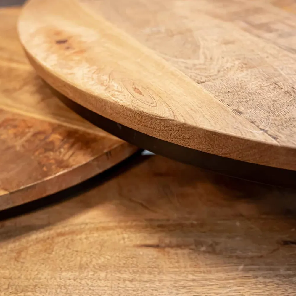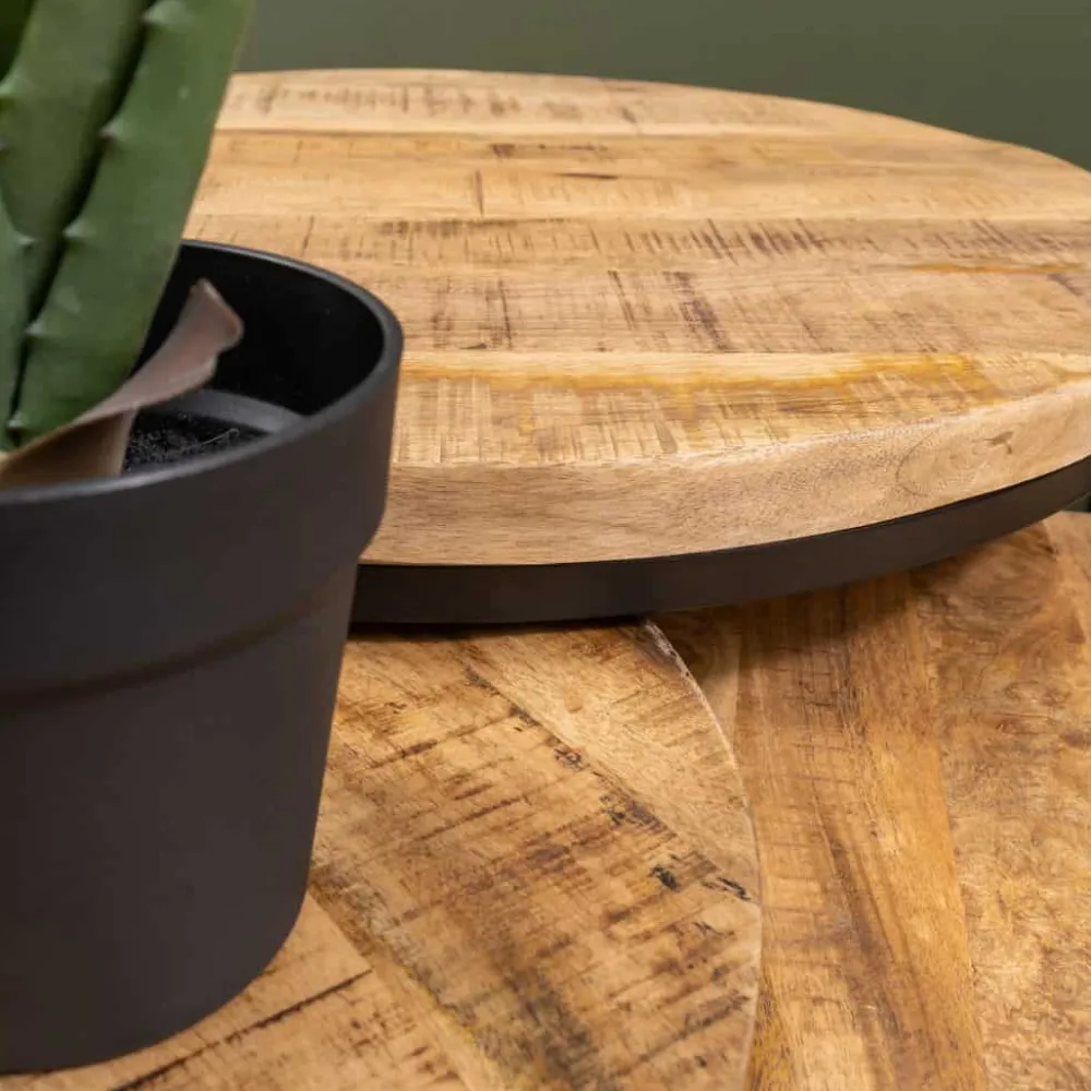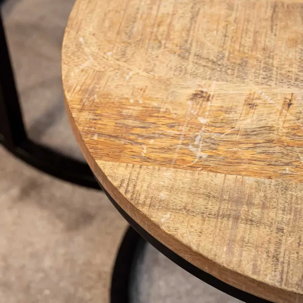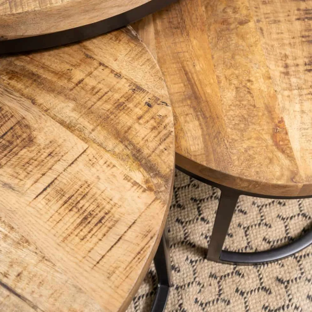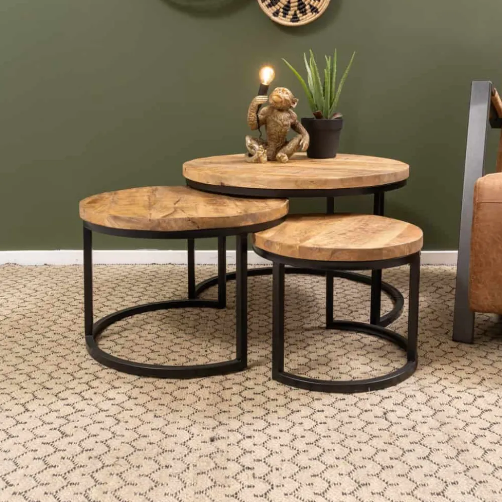 Salontafelset Anne uit de HUUS collectie combineert de warme uitstraling van mangohout met een stoer industrieel design. Deze set van drie tafels is veelzijdig in gebruik en vormt een echte blikvanger in de woonkamer. Dankzij het natuurlijke hout en het stevige metalen frame creëer je eenvoudig een moderne en robuuste sfeer in huis.