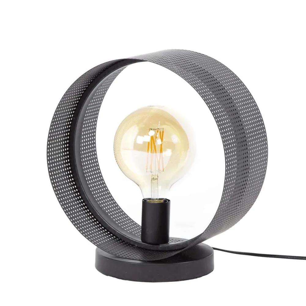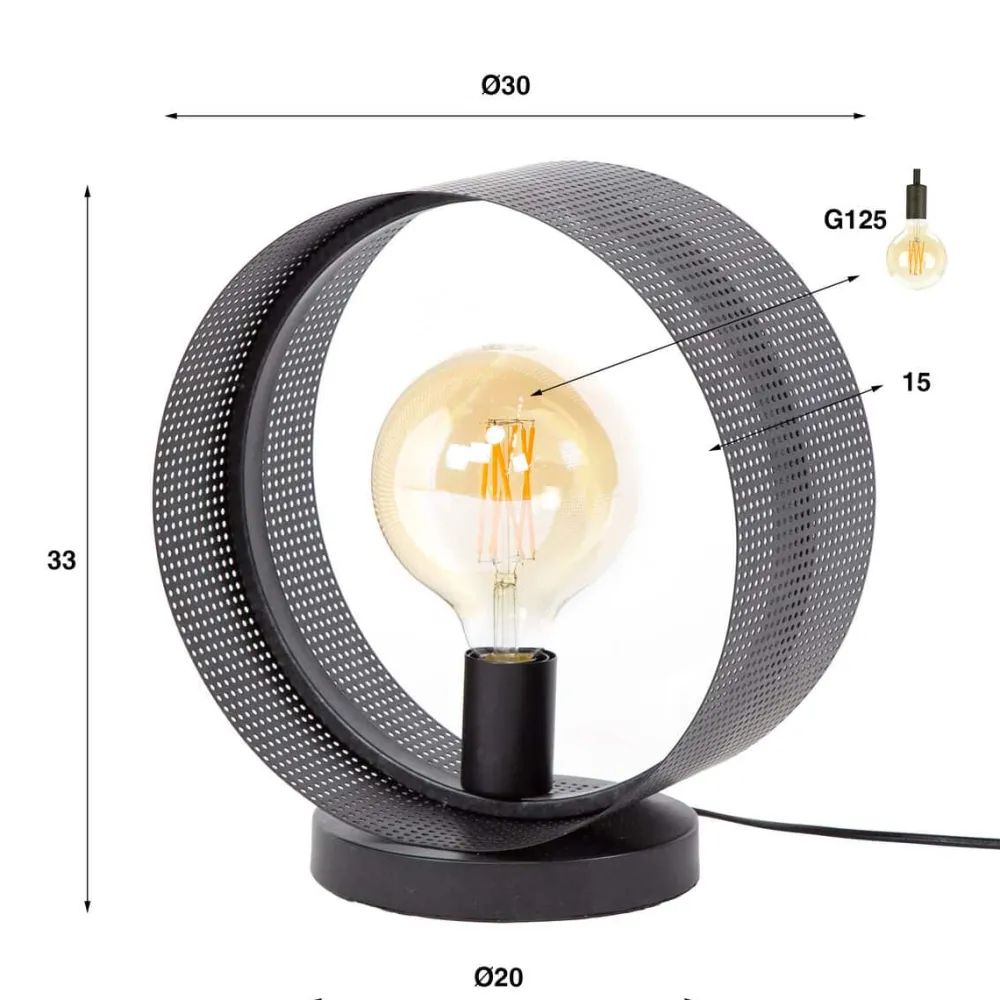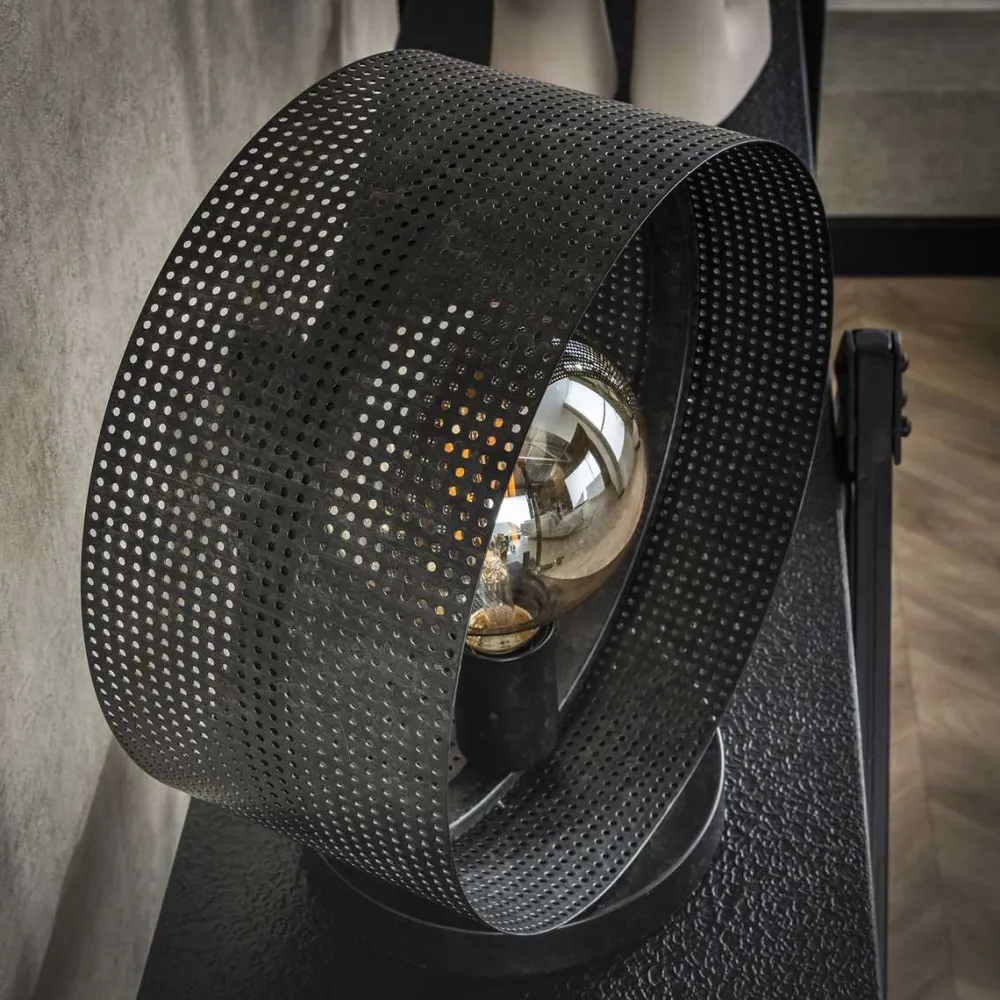 Tafellamp Angelo is afgewerkt in metaal met een charcoal finish. De cirkel is geplaatst op een rond voetje, waardoor deze stabiel staat. De open vorm en de geperforeerde kap zorgen ervoor dat de lichtbron wordt geaccentueerd. Er wordt aanbevolen om LED lichtbron Bol 12,5cm te gebruiken. Deze tafellamp heeft twee bijpassende vloerlampen en een hanglamp.