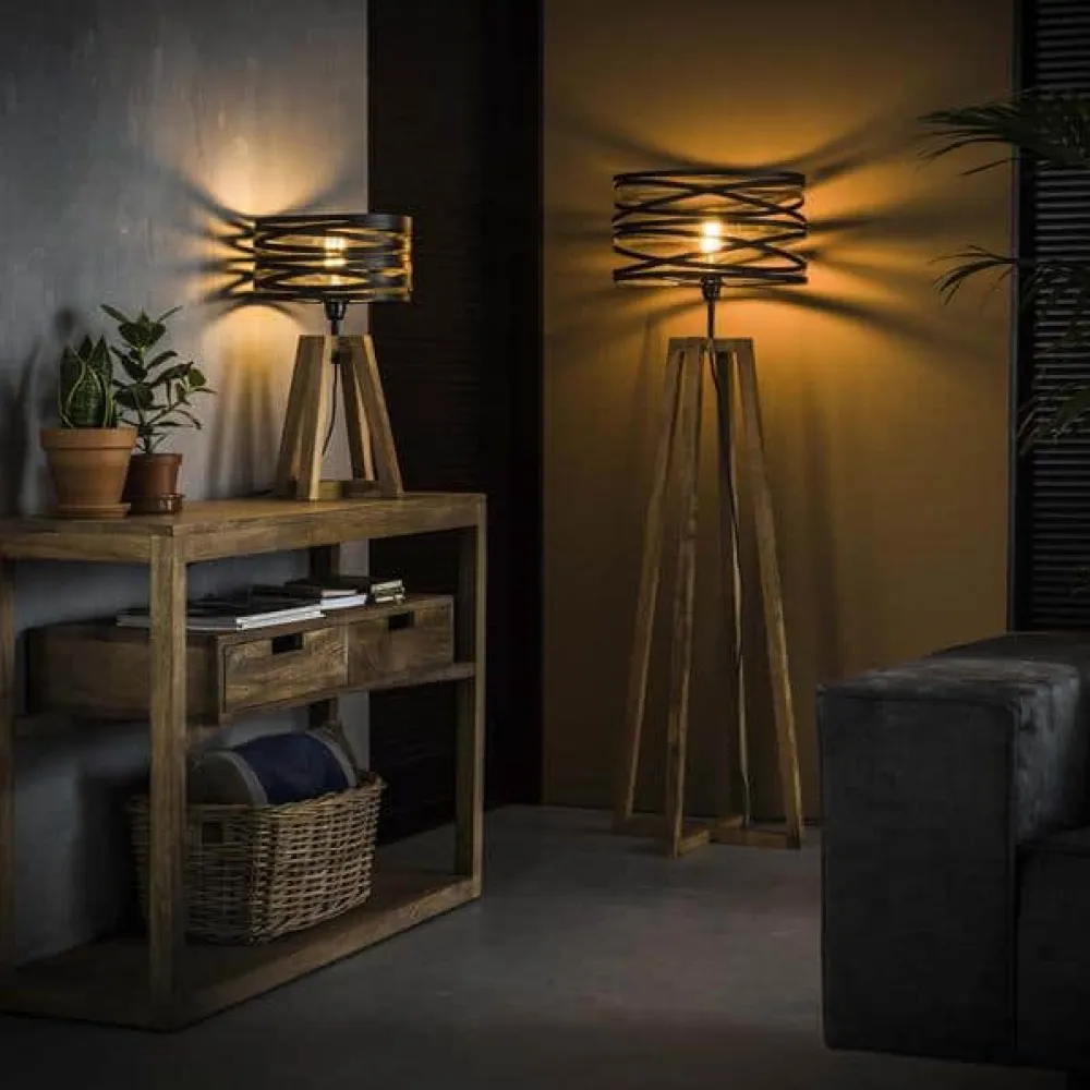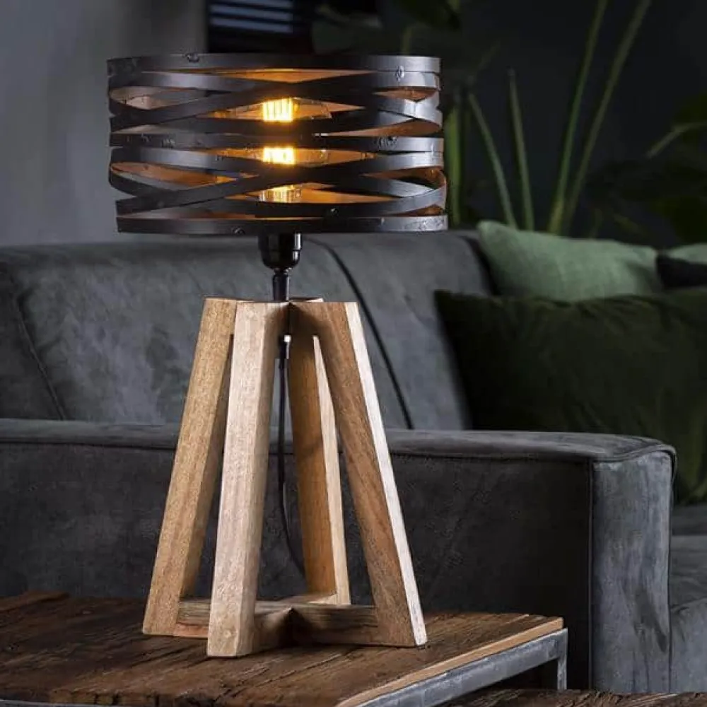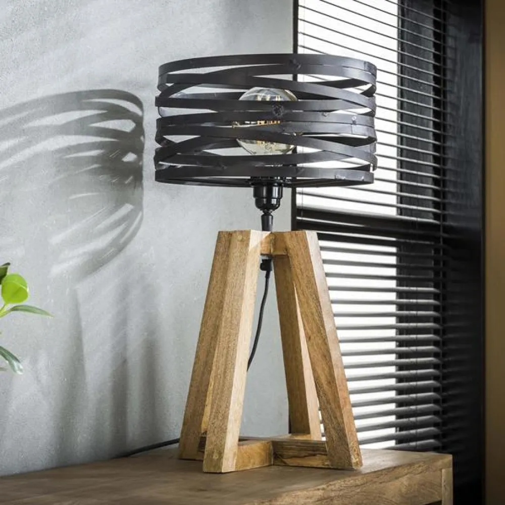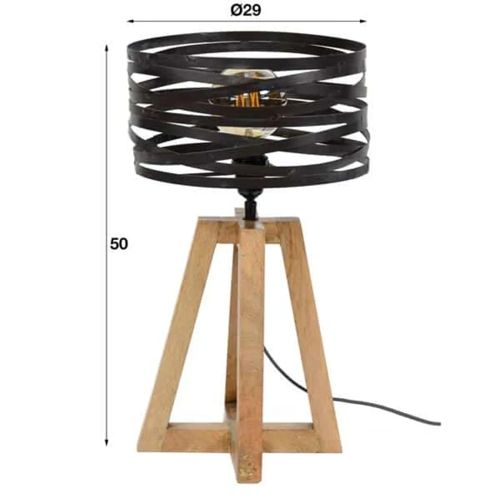 Deze trendy tafellamp heeft een getwist metalen kap in combinatie met een gekruist houten frame. De kap is afgewerkt in slate grey met een touch of brown. Het armatuur en de kap geven deze lamp een speelse eigentijdse uitstraling. Deze tafellamp maakt deel uit van serie bestaande uit een vloerlamp, een hanglamp en een tafellamp.