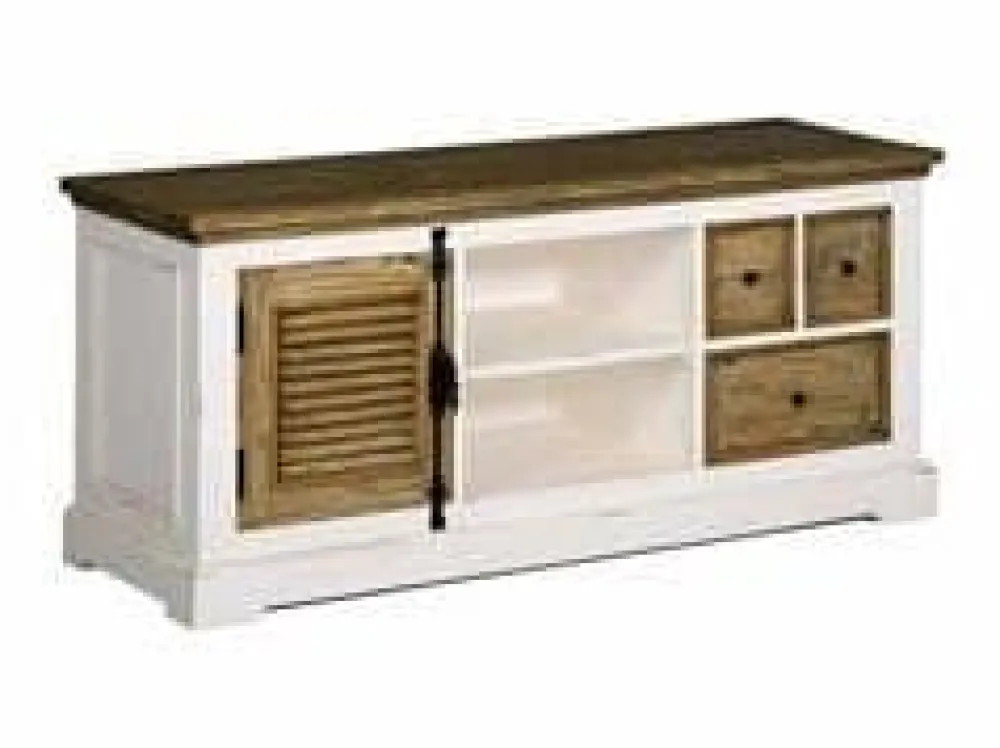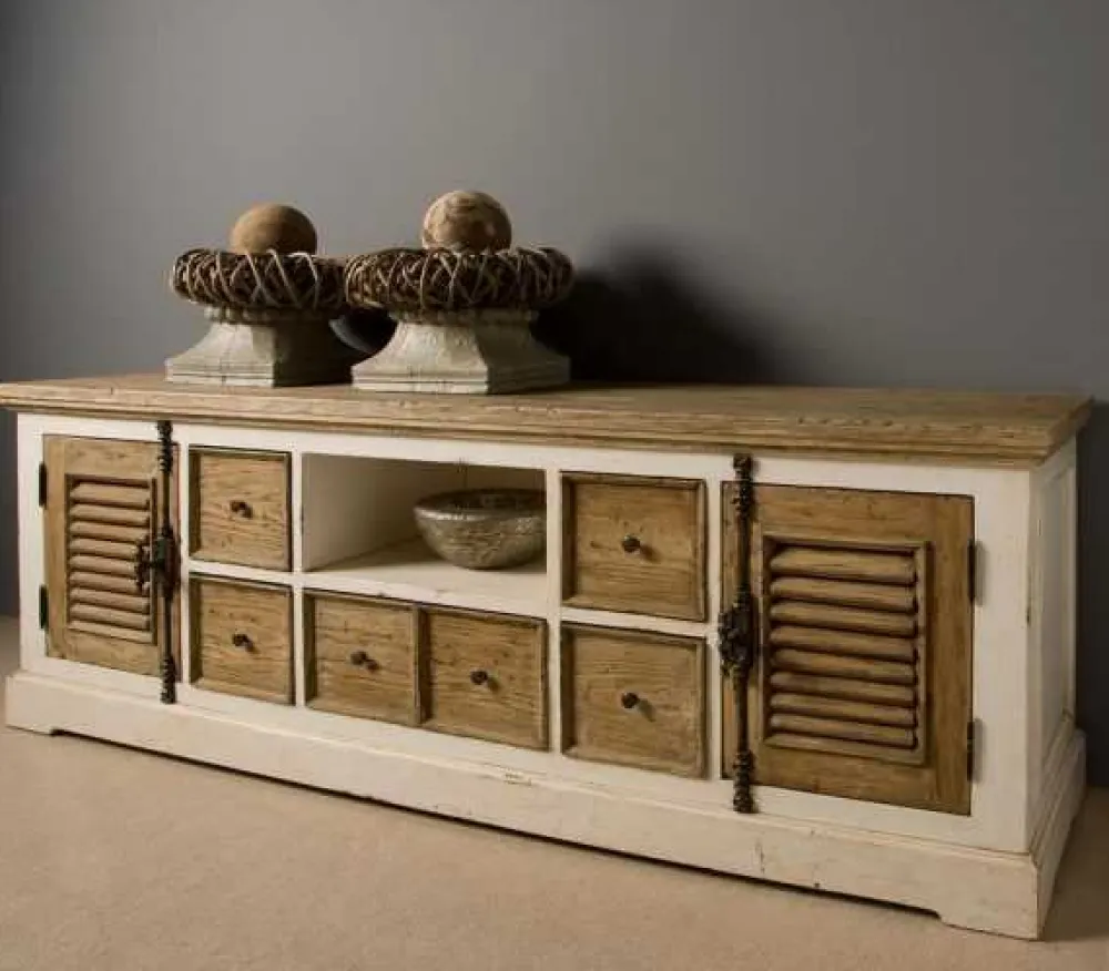 Dit meubelstuk is net als de andere meubels Amanda vervaardigd uit deels hergebruikt grenenhout, de keuze voor dit materiaal heeft erin geresulteerd dat dit prachtige tv dressoir een landelijke uitstraling heeft gekregen. De bladen in deze serie zijn afgewerkt met schaduw patina. Dit geeft een extra dimensie aan de al sterk aanwezige landelijke uitstraling van de meubels Amanda