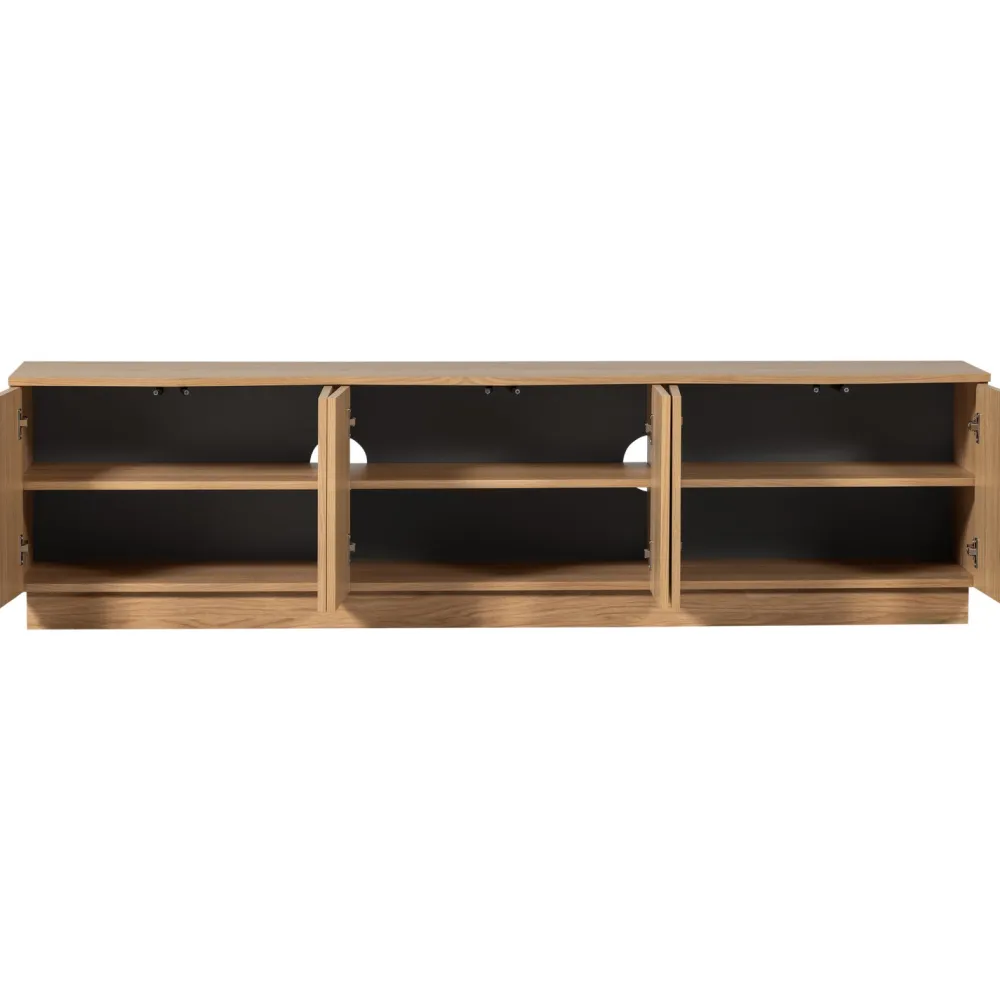 Een clean design, uniek gevormde kastdeurtjes en een mooie natuurlijke kleur. Dat zijn de kenmerken van de Zuma-serie uit de Exclusive collectie van het Nederlandse interieurmerk WOOOD. Met zijn strakke lijnen en tijdloze ontwerp voegt de Zuma TV-kast een vleugje verfijning toe aan je interieur. Het meubel is voorzien van vier deuren die toegang geven tot ruime opbergvakken, ideaal voor het organiseren van je media-apparatuur en accessoires. De nerven en knoesten in het eikenhout benadrukken de authentieke uitstraling en maken elk stuk uniek.