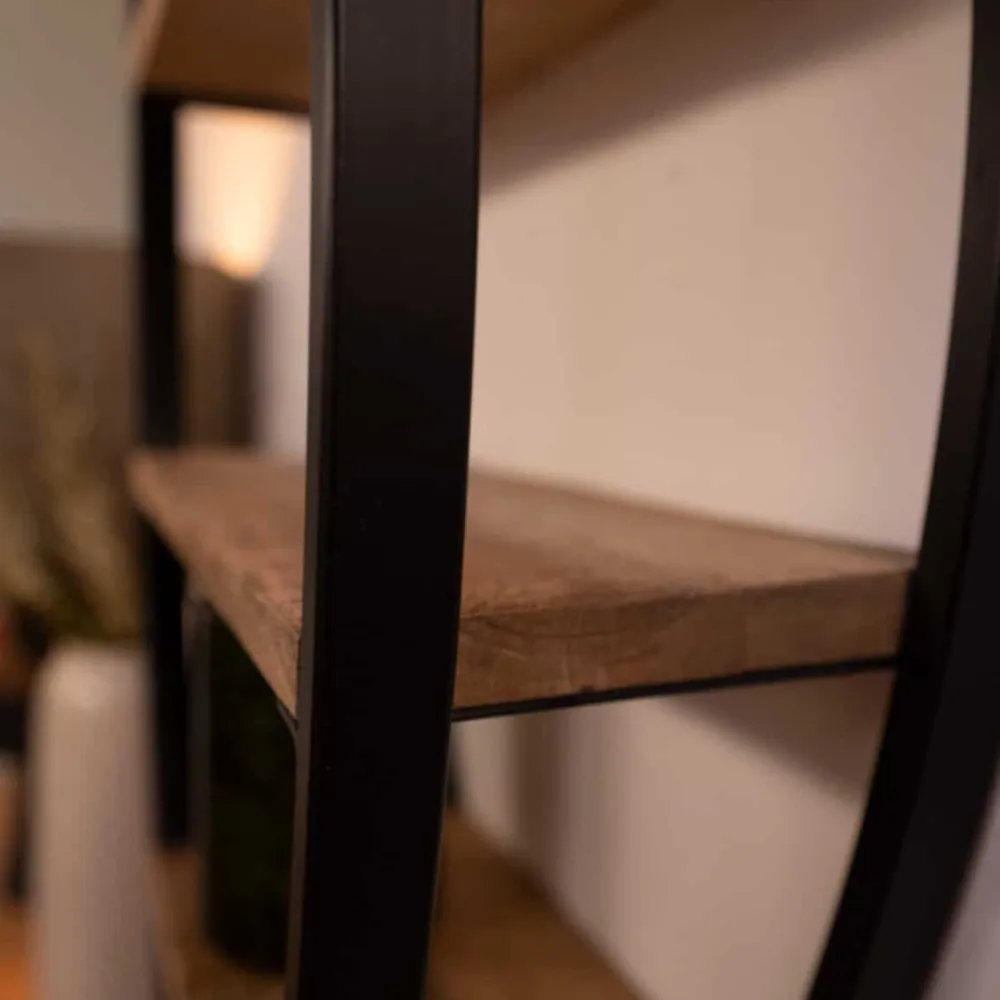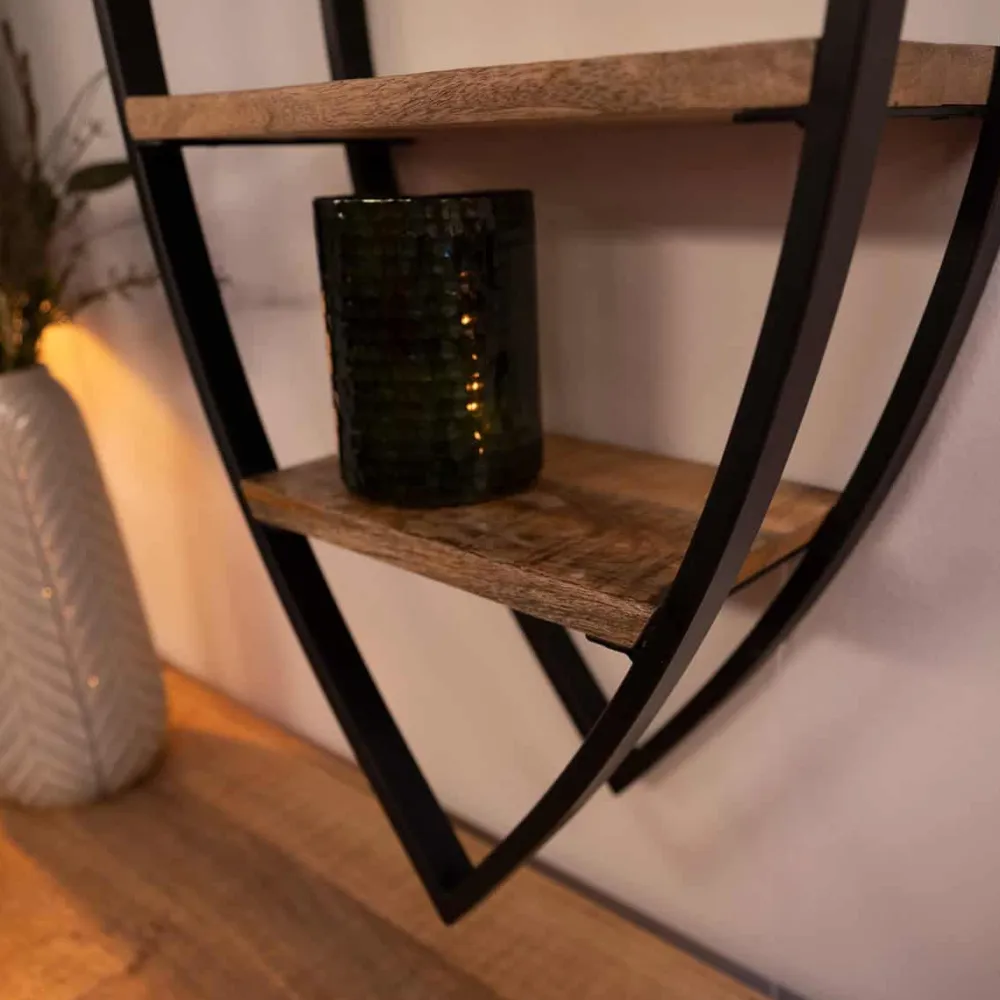 Het mangohout biedt een warme, natuurlijke look, terwijl het metalen frame zorgt voor een moderne, industriële touch. De unieke vorm van wandrek Noor maakt het een echte eyecatcher in elke ruimte, perfect voor het tentoonstellen van decoratieve items, boeken, of planten. Breng stijl en praktische opbergruimte samen in je interieur met het unieke wandrek Noor.